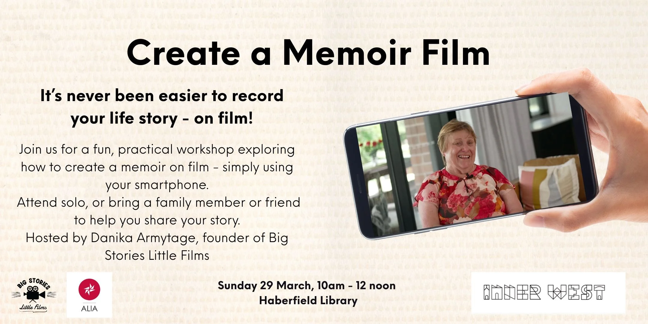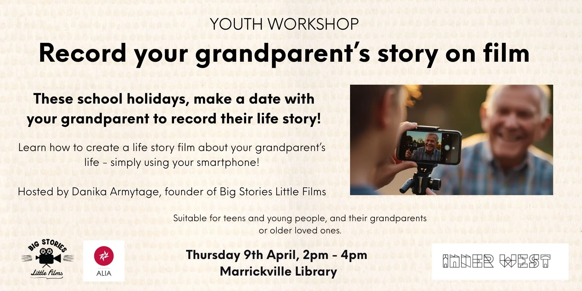 “Inner West Council Library and History have hosted multiple workshops with Danika Armytage from Big Stories Little Films. I can confidently say her workshops are among the most impactful for filming and documenting your family history. Danika brings over 20 years of experience as an award-winning television producer - having worked on major productions like The Block and Big Miracles - which translates into a professional and seamless delivery that is rare in community settings.